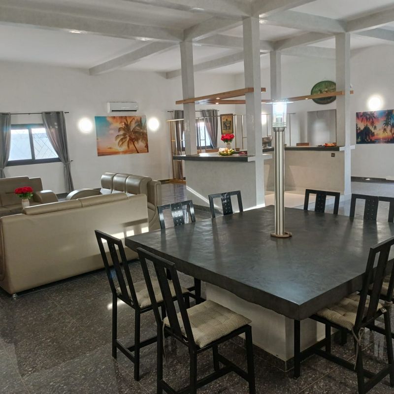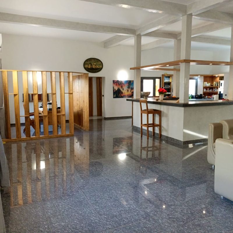 Vaste salon avec bar intégré.