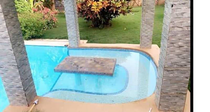 Vaste piscine originale avec son petit pool house immergé.