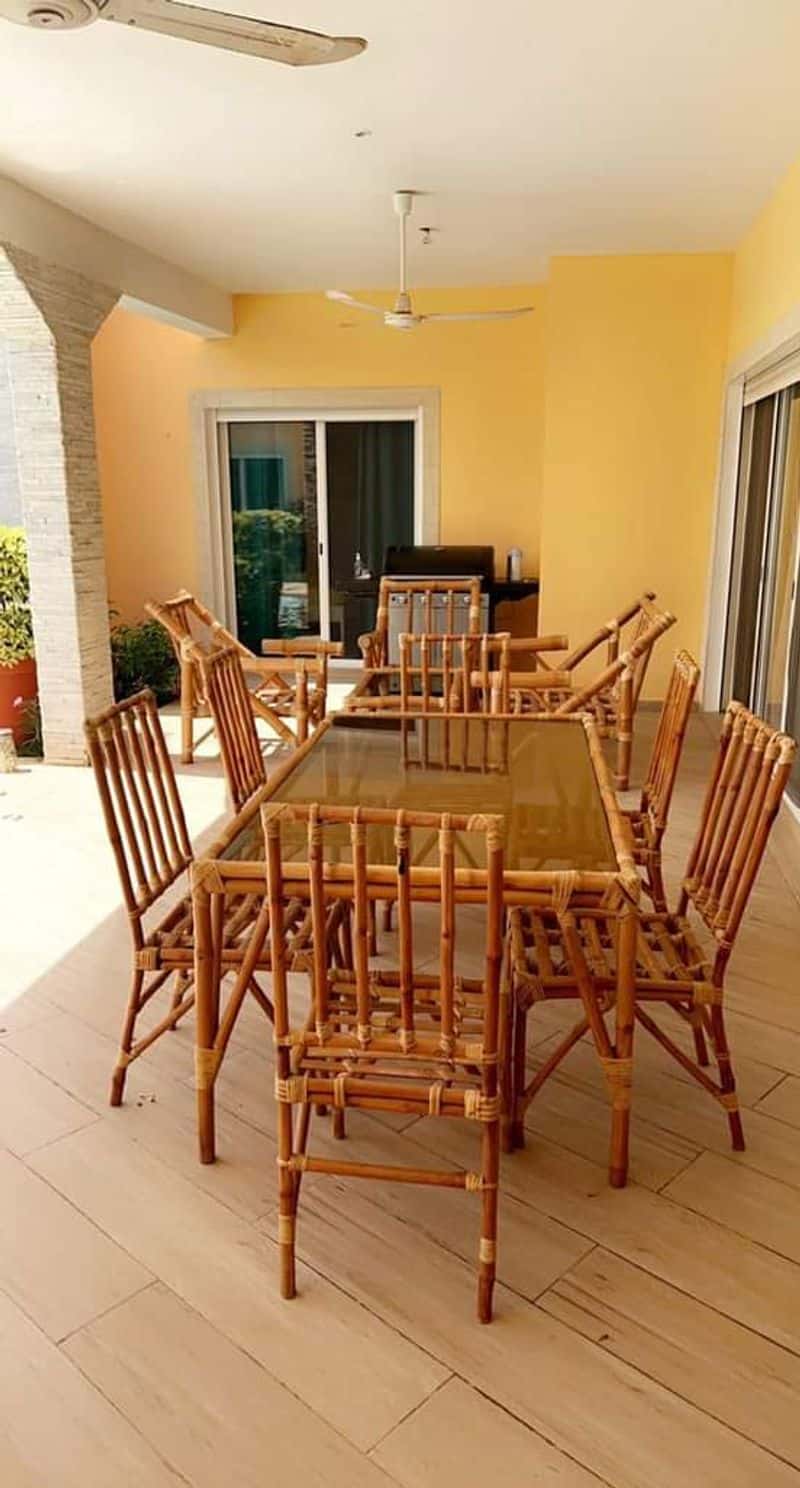 Salon,  salle à manger et terrasse couvertes conviviaux donnant sur la piscine.